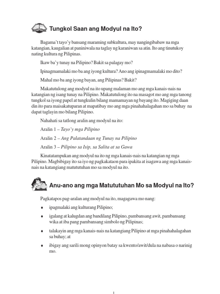 Ang mga katangian mayroon ang isang mabuting Pilipino. Kung sikat man sa ibang bansa iyang mga varsity jackets mga pop songs at kung anu ano pa na pinapasikat nila sikat naman ang mga Pilipino sa pagiging magalang at sa mabuting pakikitungo. Isaisip Mo Bawat pangkat ng tao ay may kani-kaniyang kultura tradisyon at paniniwala.
